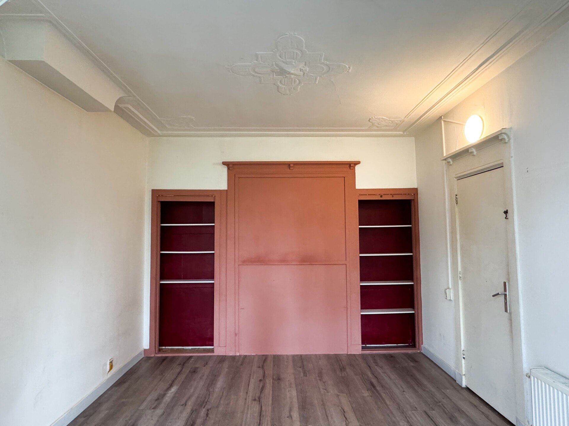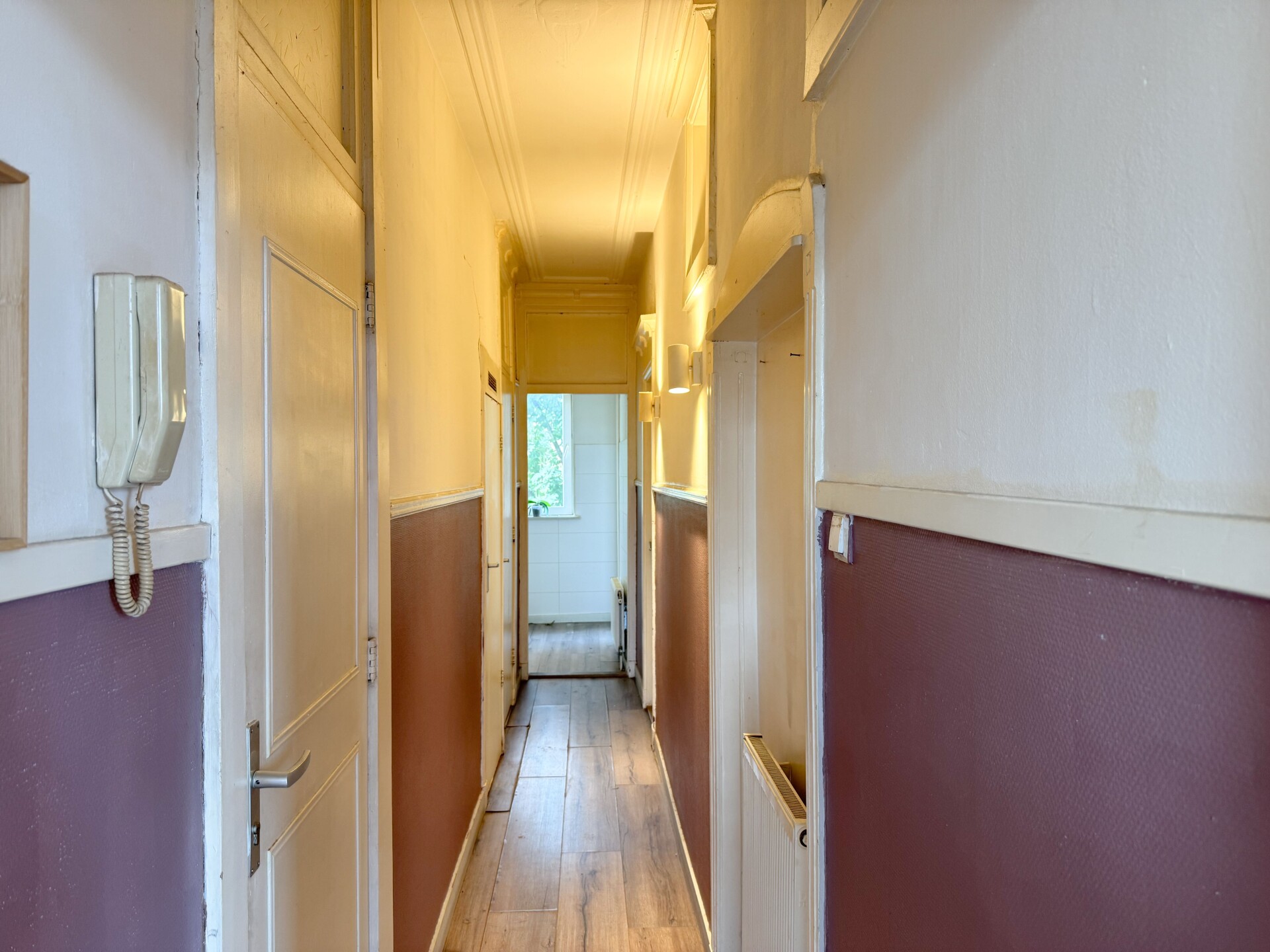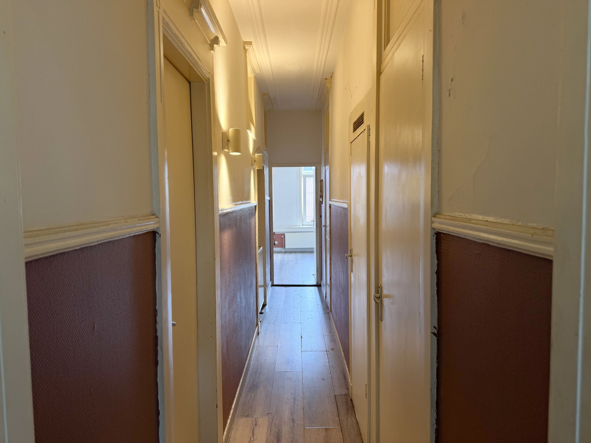 Bij binnenkomst via de gezamelijke ingang loop je naar boven naar het appartement. Bij binnenkomst kom je binnen in de karakteristieke en prachtige lange gang. Aan de rechterkant van de gang bevindt zich de woonkamer. Door de drie grote raampartijen geeft deze woning veel licht en ruimte, perfect voor een gezellige zithoek. Grenzend aan de woonkamer is de eerste slaapkamer te vinden, deze wordt gescheiden door een deur vanaf de woonkamer.