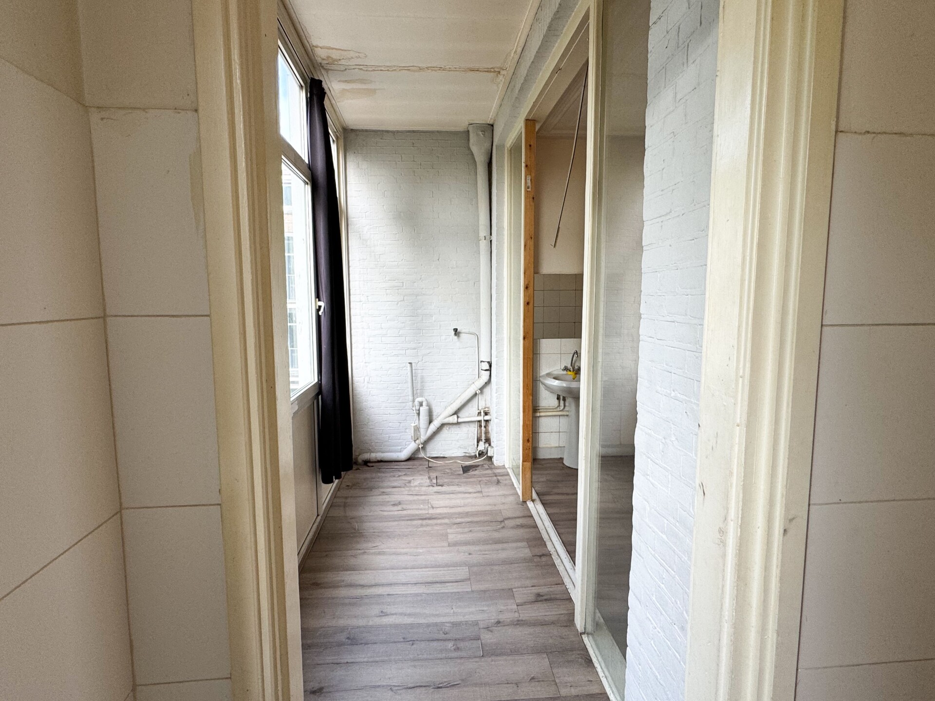 Aan de andere kant van de gang is de keuken te vinden. Deze geeft uitzicht op de bomen en de speeltuin die iets verderop ligt. De keuken beschikt over een 4-pits gasstel, wasbak en afzuiger. De keuken geeft daarnaast ook toegang tot het inpandige balkon. Hier is eventueel een aansluiting voor wasmachine/droger. Vanaf het balkon kun je de tweede (hoofd) slaapkamer betreden. Deze slaapkamer is ruim en beschikt over een wastafel. De douche en toilet bevinden zich in de gang.